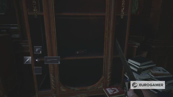 चला सर्वात स्पष्ट एकासह प्रारंभ करूया. जेव्हा आपण खोलीत फिरता तेव्हा सरळ आपल्या पुढे पहा. माणसाच्या डोक्याच्या दिवाळेच्या शेजारी टेबलावर बसलेली एक घंटा आपल्याला दिसेल. शूट करा. आपण एखाद्या मौल्यवान बुलेटचे संवर्धन करू इच्छित असल्यास आपण येथे चाकूने देखील मारू शकता.