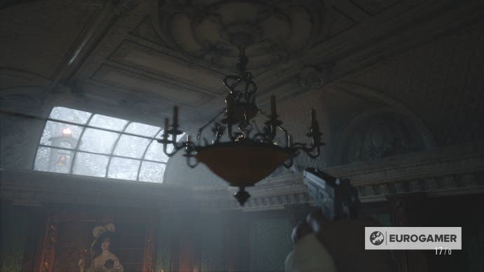 पुढील दोनसाठी, आपल्याला खोलीच्या मागील बाजूस लहान पाय air ्या चढण्याची आवश्यकता आहे. एक घंटा प्रत्यक्षात झूमरवर लपलेला आहे. हे त्वरित दृश्यमान नाही, हे शोधणे सर्वात कठीण बनवते. झूमर शूट करा आणि ती थोडीशी स्विंग करेल, घंटा प्रकट करेल. शूट करा आणि आपण जवळजवळ पूर्ण केले.