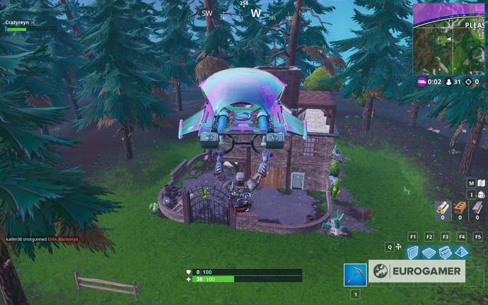Ten westen van Pleasant Park is een vervallen huis dat alleen in het midden van het bos staat. Ga daarheen en onder de zuidoostelijke hoek van het huis vindt u de letter o locatie door een skip.
