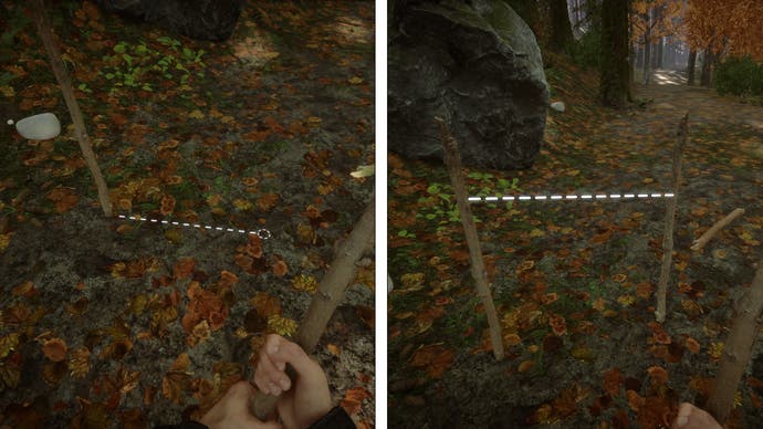 Items zoals logboeken en sticks hebben meerdere opties die kunnen worden geschakeld door op de rechter muisknop te drukken terwijl ze naar de grond kijkt. Voor logboeken kunt u ze verticaal plaatsen, terwijl sticks kunnen worden gebroken of in de grond kunnen worden geplakt.