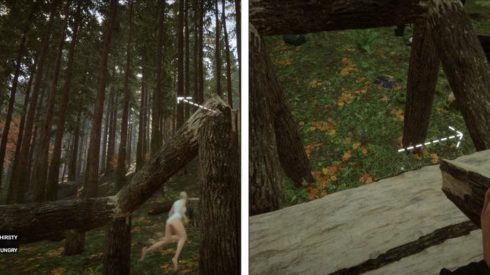 Tenzij je in een vreedzame modus speelt, die geen kannibalen of mutanten heeft, raden we je aan om te beginnen met een boomhut – Tree Shelter 1. Selecteer met uw buildboek aan de linkerkant de structuur en plaats de witte omtrek op een boom. U kunt Kelvin het beste bestellen om logboeken te verzamelen, maar de logboeken aan de structuur zelf toevoegen.