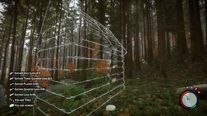 Zonen van het bos maakt gebruik van twee verschillende bouwstijlen. Eén is vergelijkbaar met de vorige game, Het bos, zodat u de bouwblauwdrukken kunt plaatsen. Dit wordt gedaan via het gidsboek, toegankelijk via de inventaris of de B -toets. Druk op X schakelt van modi naar het blauwdrukbouwsysteem. Van daaruit kunt u elke categorie gebouw doorlopen met behulp van de juiste tabbladen of elke pagina scrollen door op de knoppen onderaan te klikken.